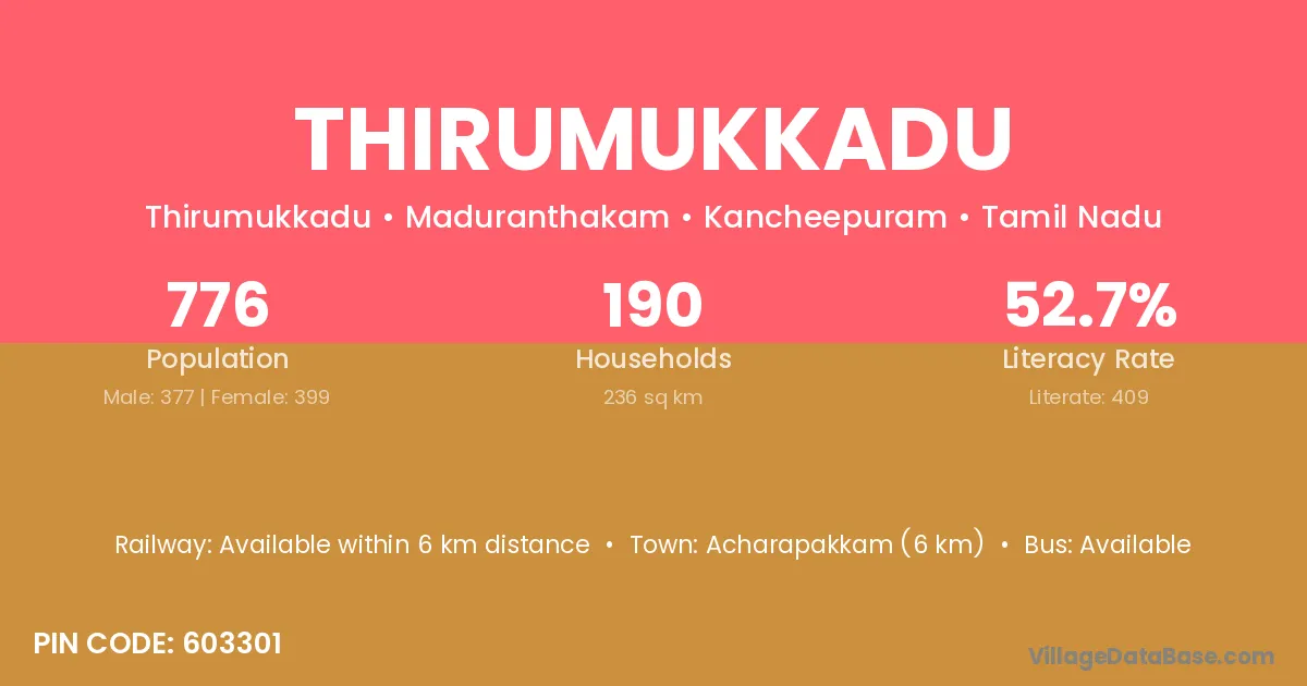 Acharapakkam (6 km) is the nearest town to Thirumukkadu village for major economic activities and is located approximately 6 km away.