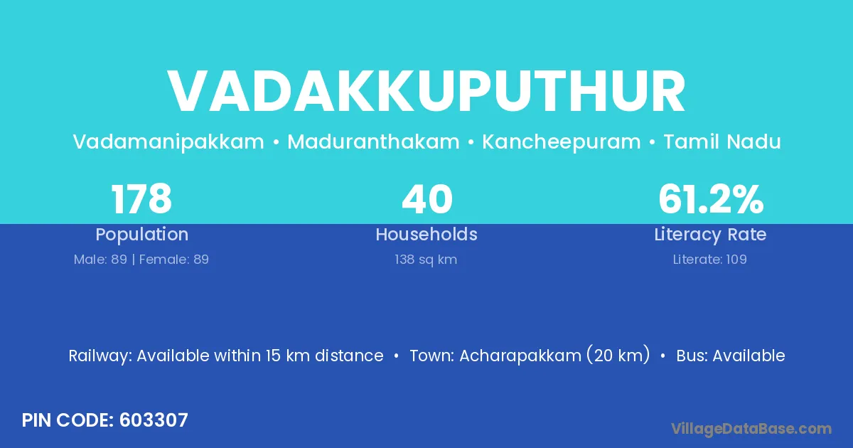 Vadakkuputhur village has a total population of 178 people, of which 89 are males and 89 are females.