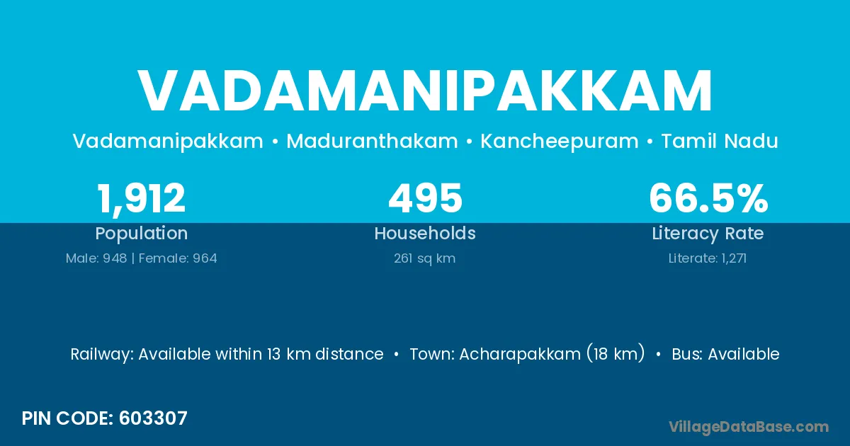 Vadamanipakkam village has a total population of 1,912 people, of which 948 are males and 964 are females.