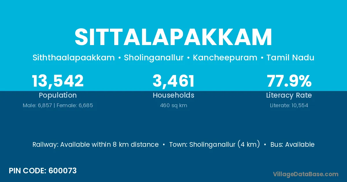Sholinganallur (4 km) is the nearest town to Sittalapakkam village for major economic activities and is located approximately 4 km away.