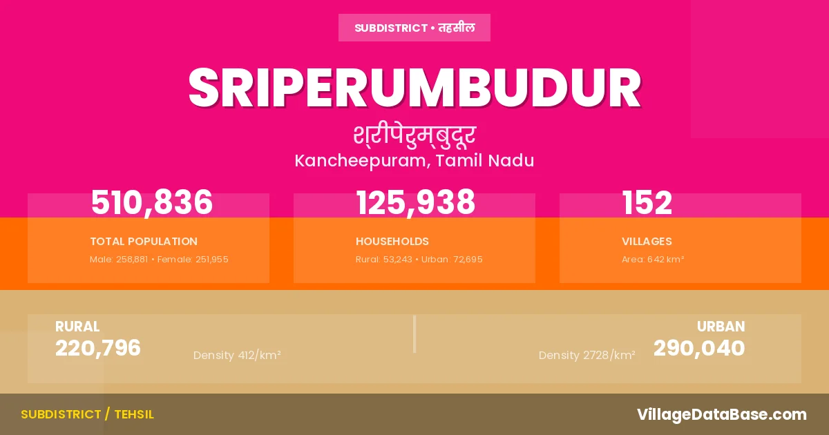 According to the 2011 census The total area of Sriperumbudur Taluka is 642 km², with a population of 510836 people. The population density is 795 inhabitants per square kilometre, and there are approximately 125938 houses in the sub district.