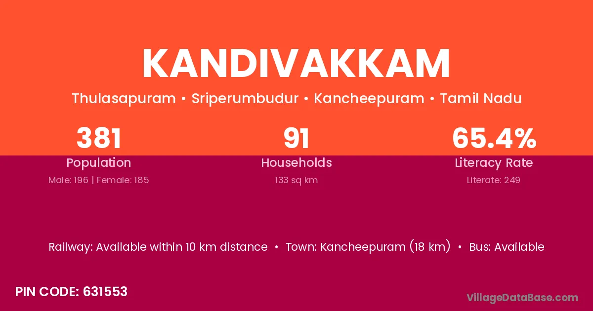 Kandivakkam village has a total population of 381 people, of which 196 are males and 185 are females.