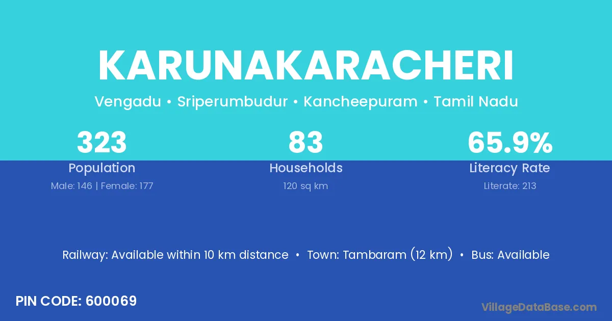 Tambaram (12 km) is the nearest town to Karunakaracheri village for major economic activities and is located approximately 12 km away.