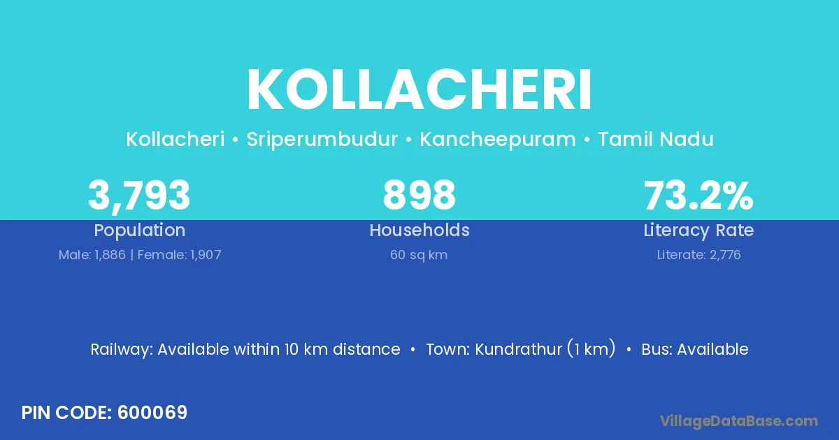 Kundrathur (1 km) is the nearest town to Kollacheri village for major economic activities and is located approximately 1 km away.