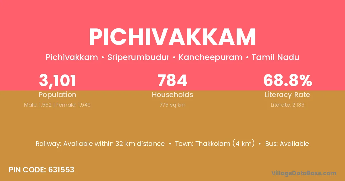 Thakkolam (4 km) is the nearest town to Pichivakkam village for major economic activities and is located approximately 4 km away.