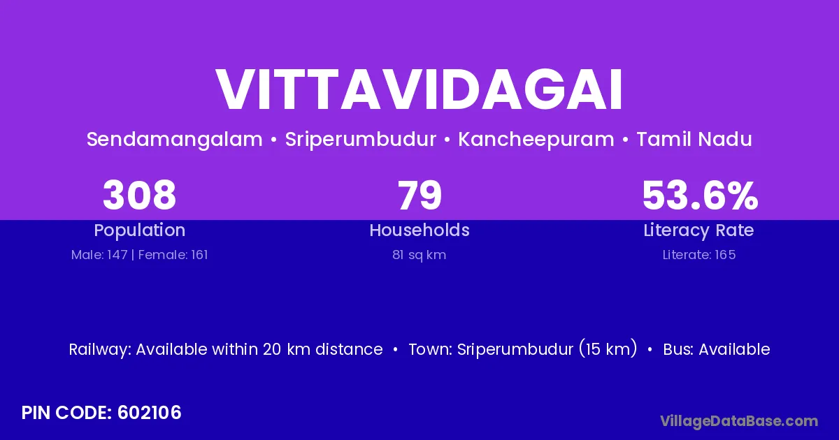 Sriperumbudur (15 km) is the nearest town to Vittavidagai village for major economic activities and is located approximately 15 km away.