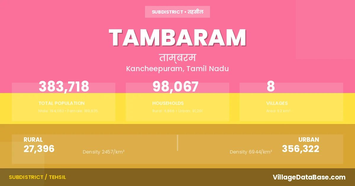 According to the 2011 census The total area of Tambaram Taluka is 62 km², with a population of 383718 people. The population density is 6,143 inhabitants per square kilometre, and there are approximately 98067 houses in the sub district.