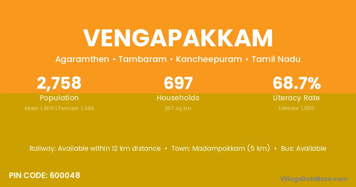 Madampakkam (5 km) is the nearest town to Vengapakkam village for major economic activities and is located approximately 5 km away.