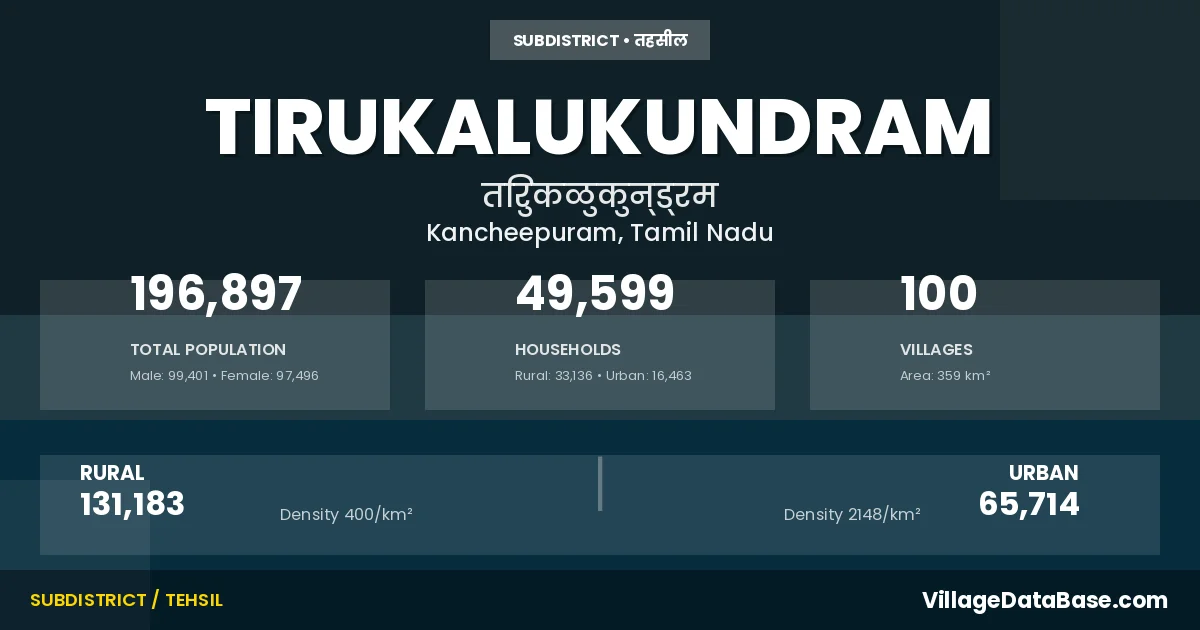 According to the 2011 census The total area of Tirukalukundram Taluka is 359 km², with a population of 196897 people. The population density is 549 inhabitants per square kilometre, and there are approximately 49599 houses in the sub district.