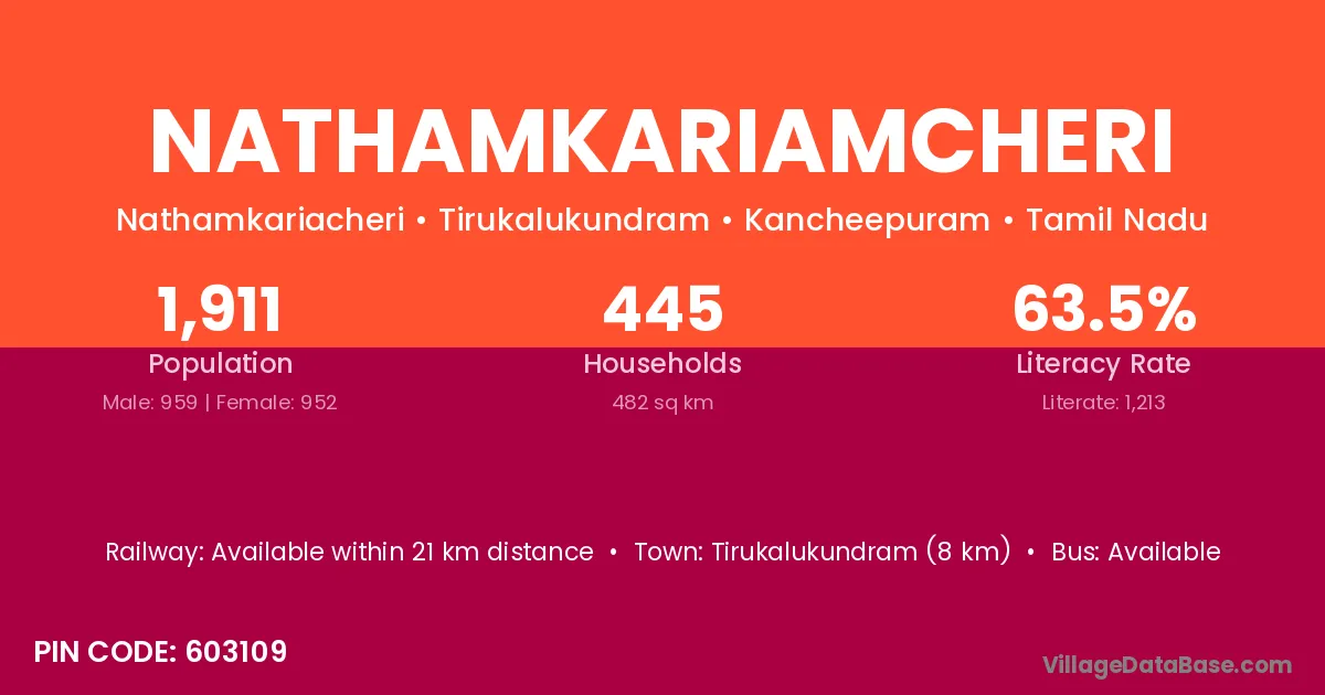 Nathamkariamcheri village has a total population of 1,911 people, of which 959 are males and 952 are females.