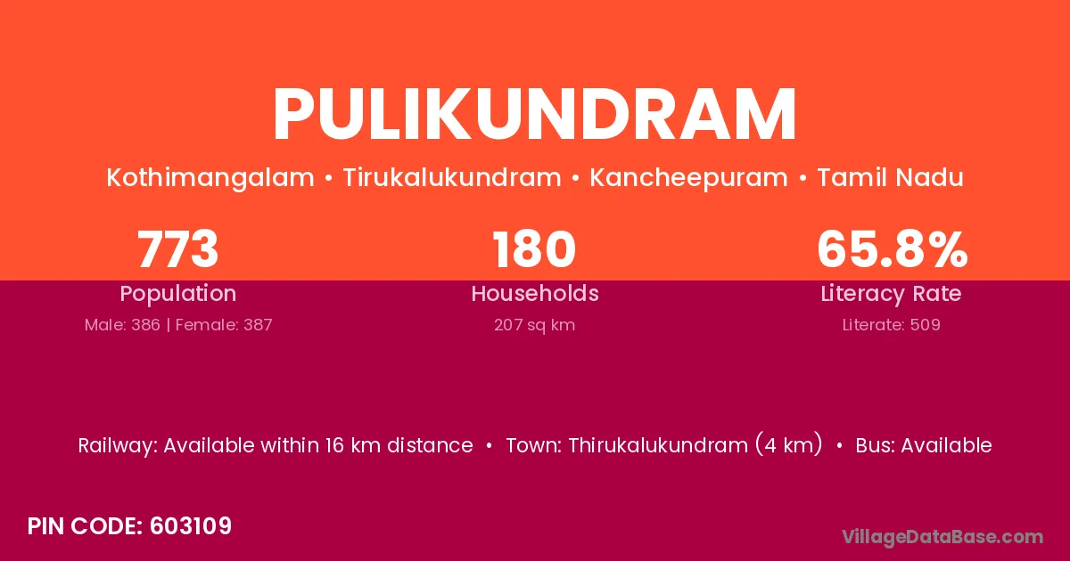 Pulikundram village has a total population of 773 people, of which 386 are males and 387 are females.