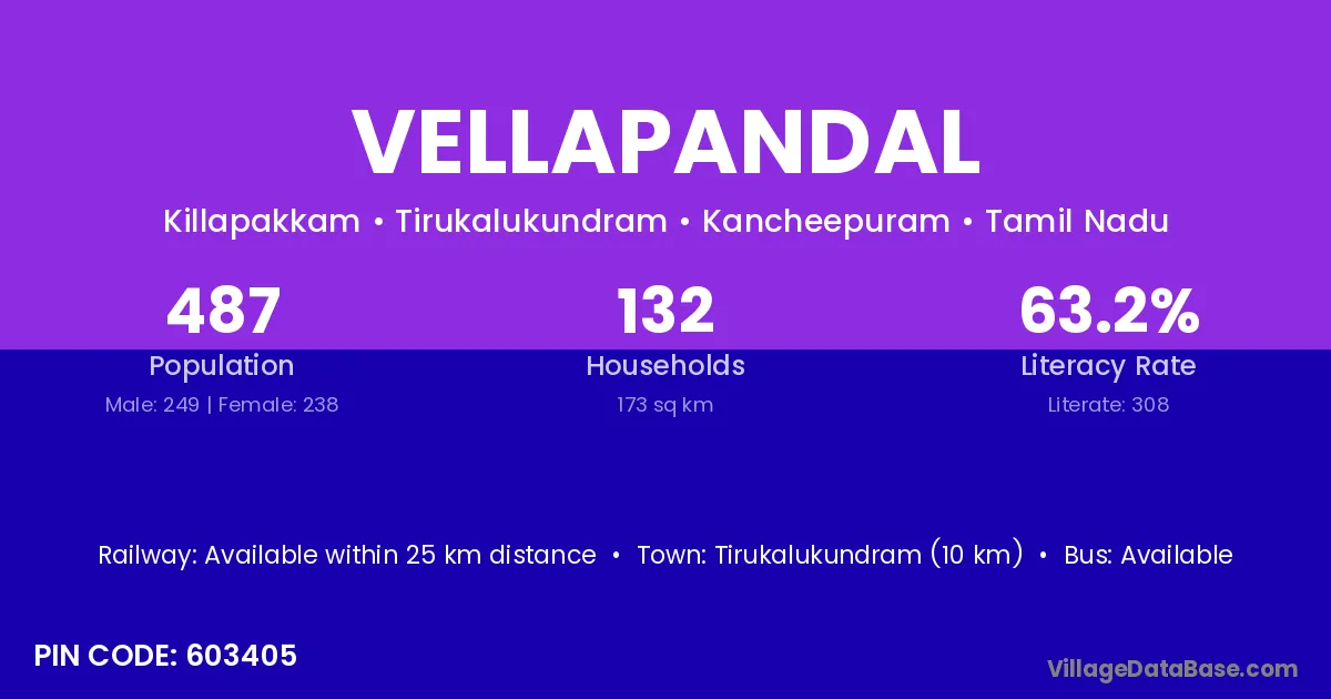 Vellapandal village has a total population of 487 people, of which 249 are males and 238 are females.