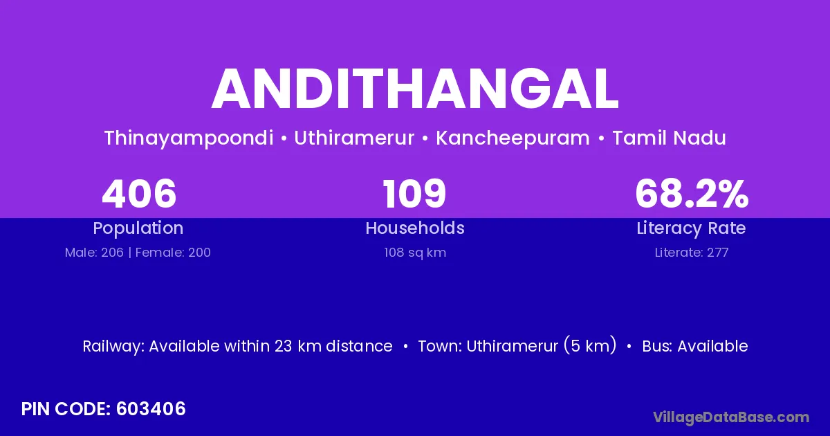Uthiramerur (5 km) is the nearest town to Andithangal village for major economic activities and is located approximately 5 km away.