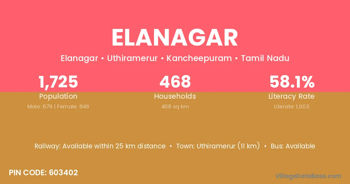 Uthiramerur (11 km) is the nearest town to Elanagar village for major economic activities and is located approximately 11 km away.