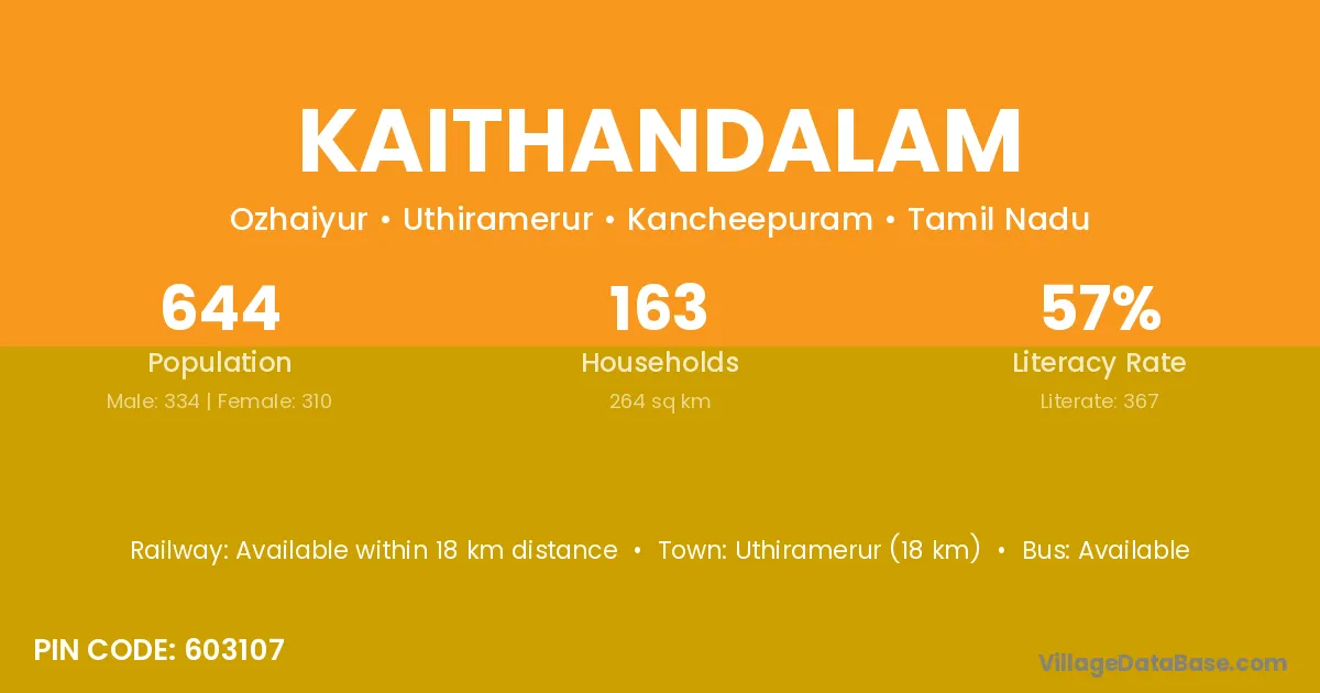 Uthiramerur (18 km) is the nearest town to Kaithandalam village for major economic activities and is located approximately 18 km away.