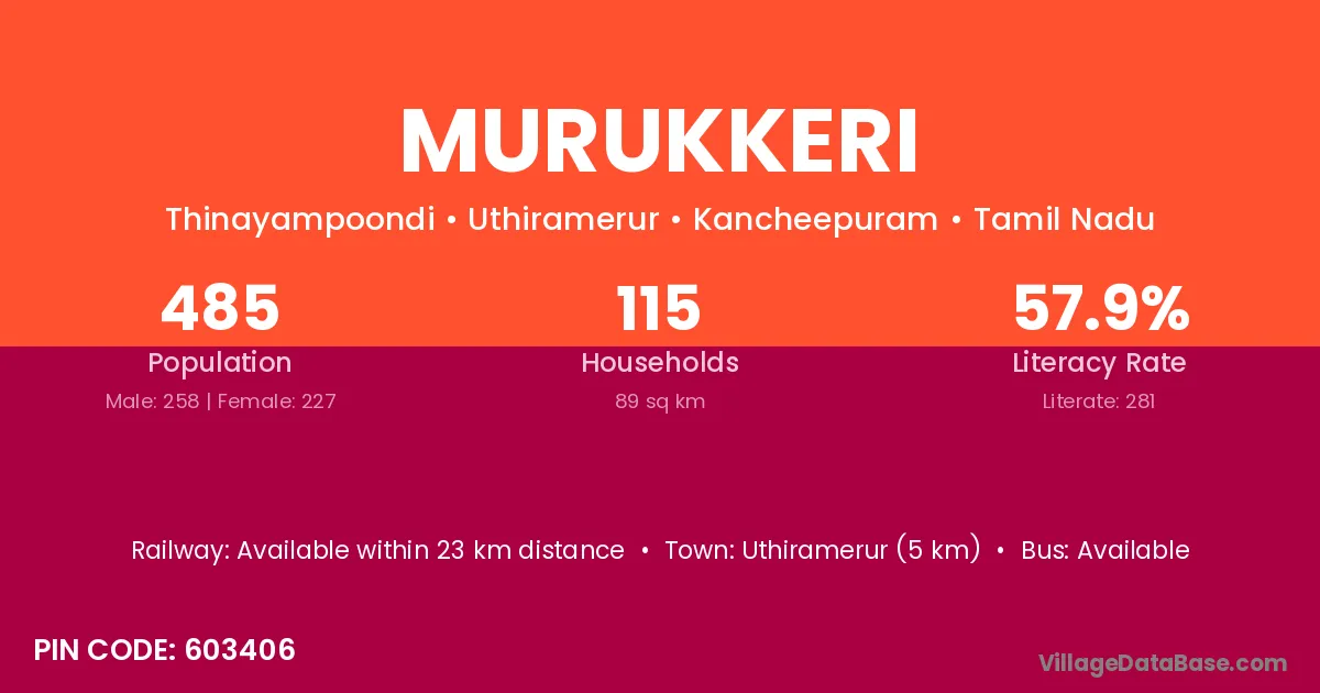 Uthiramerur (5 km) is the nearest town to Murukkeri village for major economic activities and is located approximately 5 km away.