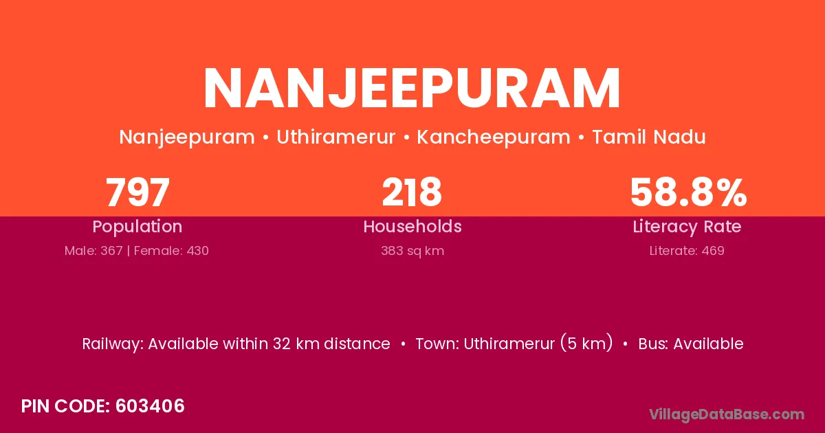 Uthiramerur (5 km) is the nearest town to Nanjeepuram village for major economic activities and is located approximately 5 km away.