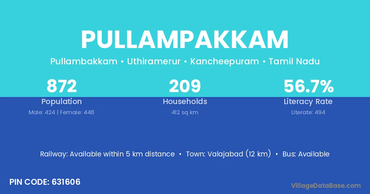 Pullampakkam village has a total population of 872 people, of which 424 are males and 448 are females.