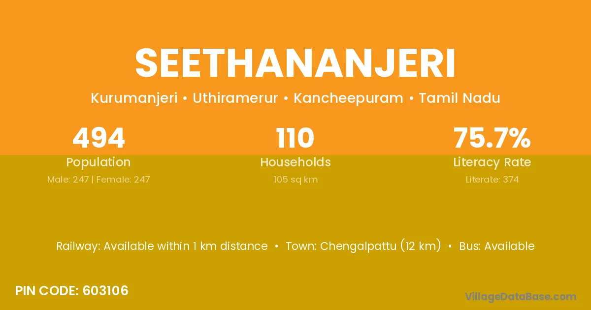 Seethananjeri village has a total population of 494 people, of which 247 are males and 247 are females.