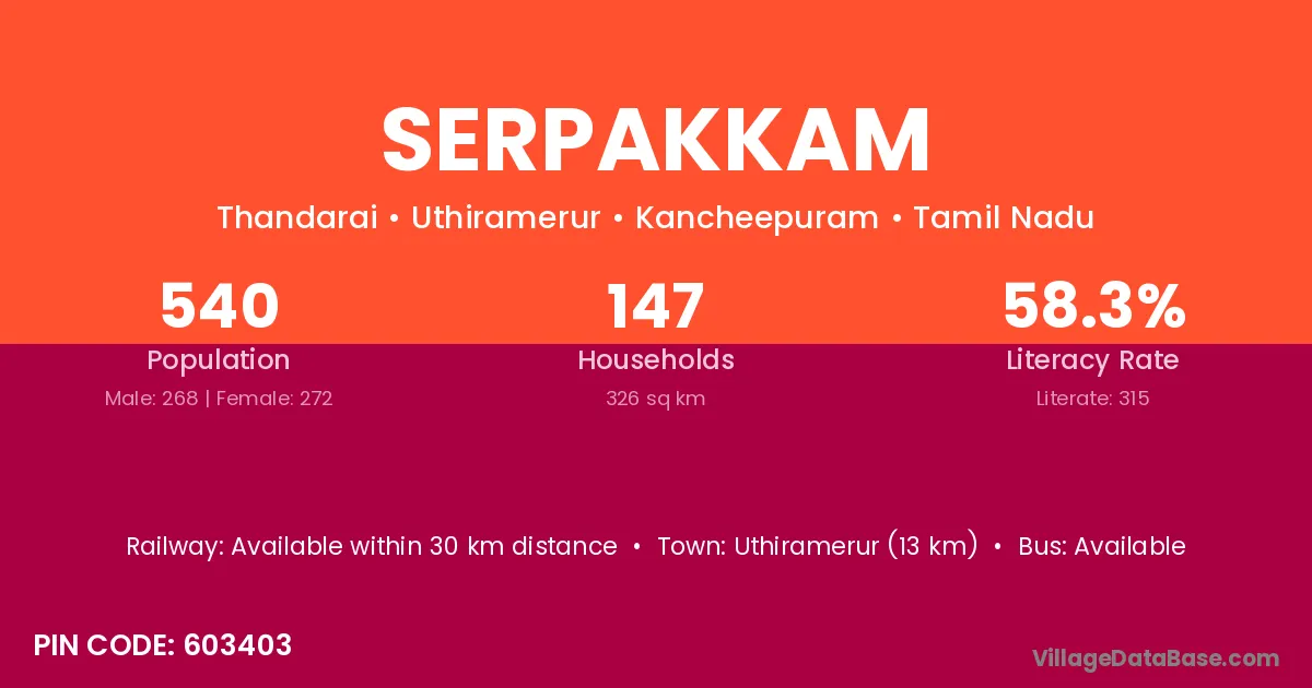 Uthiramerur (13 km) is the nearest town to Serpakkam village for major economic activities and is located approximately 13 km away.