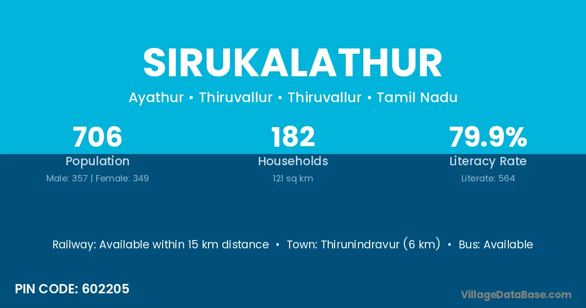 Uthiramerur (15 km) is the nearest town to Sirukalathur village for major economic activities and is located approximately 15 km away.