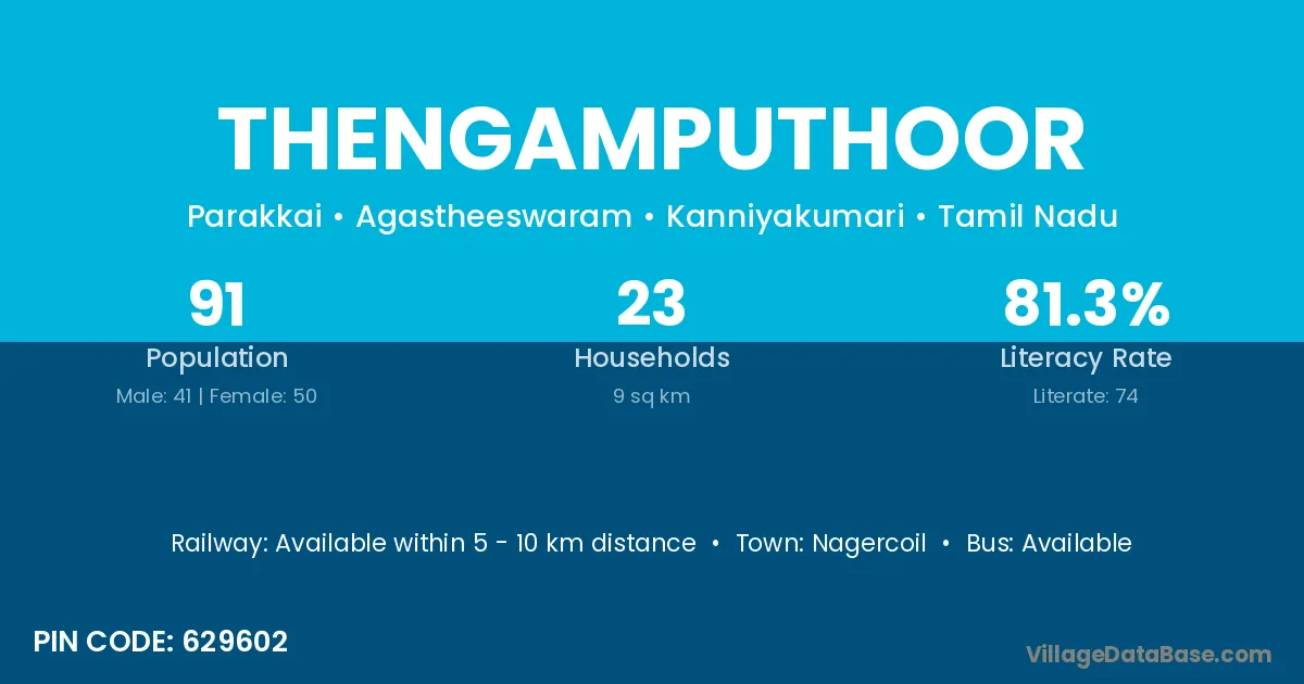 Thengamputhoor village has a total population of 91 people, of which 41 are males and 50 are females.