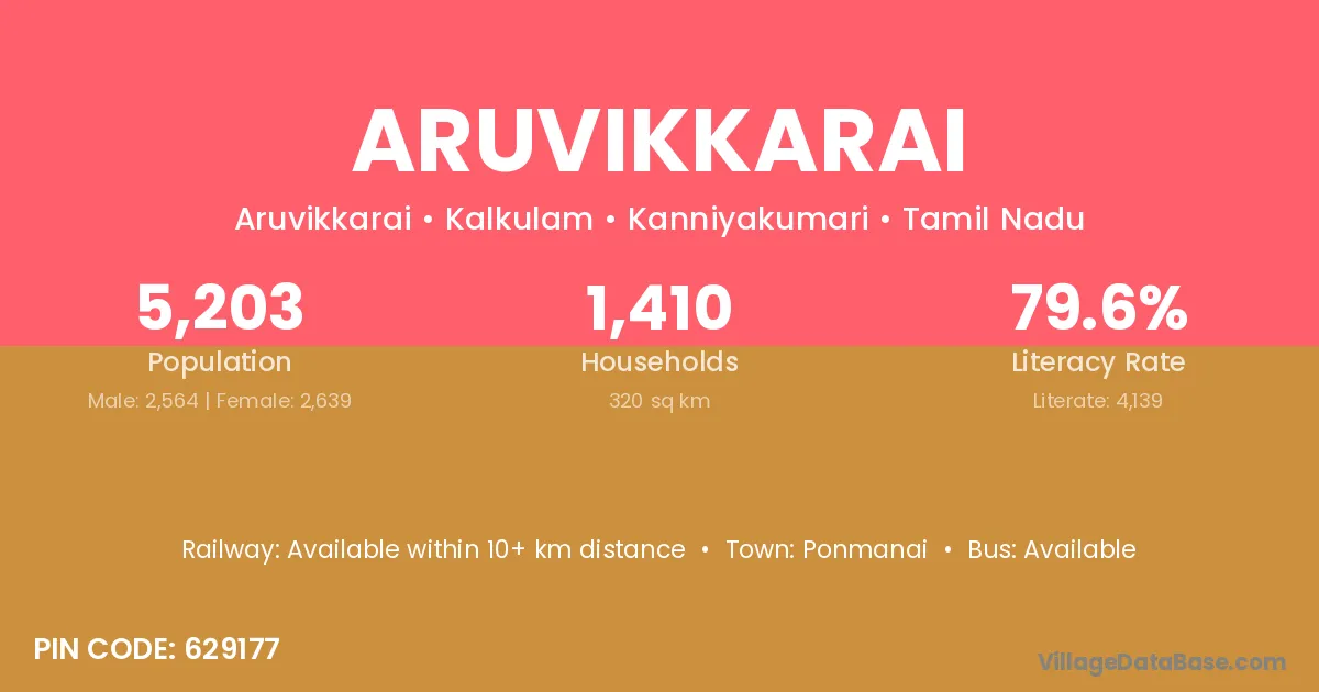 Aruvikkarai village has a total population of 5,203 people, of which 2,564 are males and 2,639 are females.