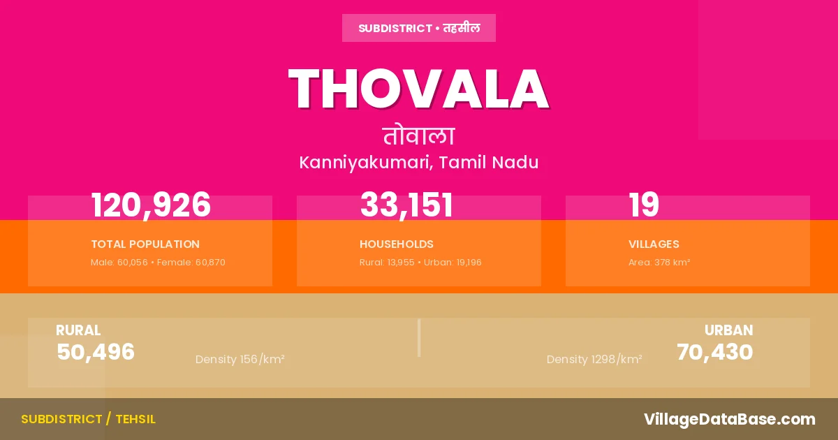 According to the 2011 census The total area of Thovala Taluka is 378 km², with a population of 120926 people. The population density is 320 inhabitants per square kilometre, and there are approximately 33151 houses in the sub district.