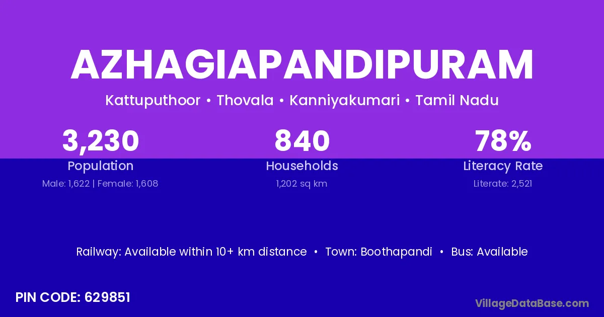 Azhagiapandipuram village has a total population of 3,230 people, of which 1,622 are males and 1,608 are females.