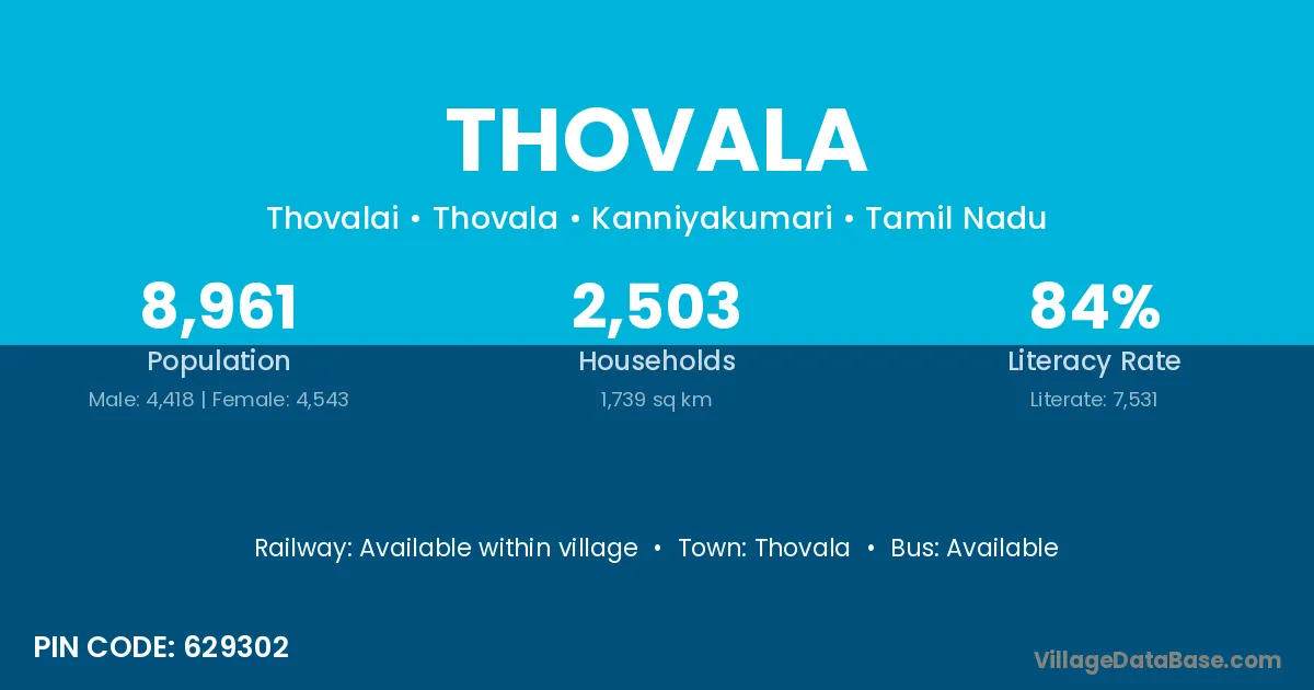 Thovala village has a total population of 8,961 people, of which 4,418 are males and 4,543 are females.