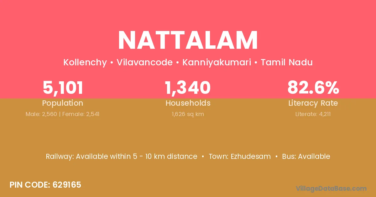 Nattalam village has a total population of 5,101 people, of which 2,560 are males and 2,541 are females.