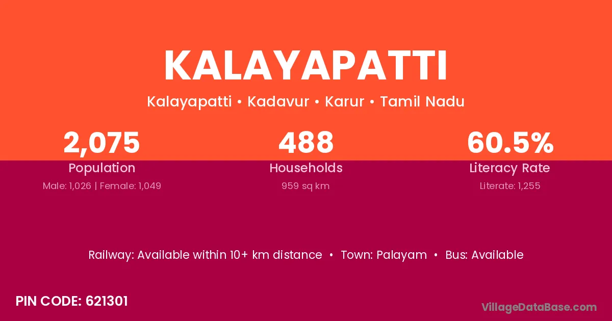 Kalayapatti village has a total population of 2,075 people, of which 1,026 are males and 1,049 are females.