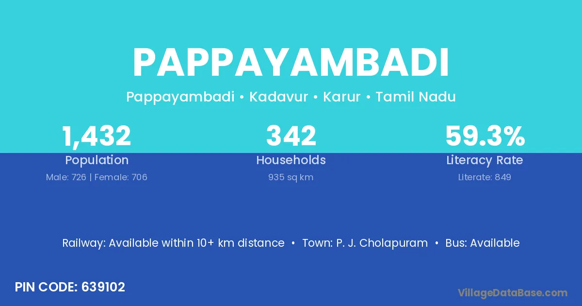 Pappayambadi village has a total population of 1,432 people, of which 726 are males and 706 are females.