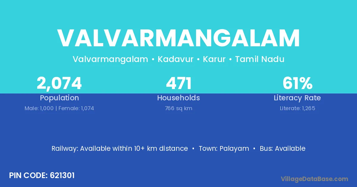 According to Census 2011 information, the village code of Valvarmangalam village is 621301.