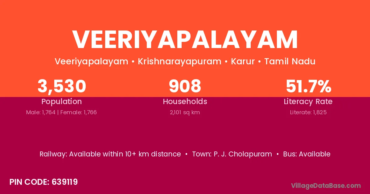 Veeriyapalayam village has a total population of 3,530 people, of which 1,764 are males and 1,766 are females.
