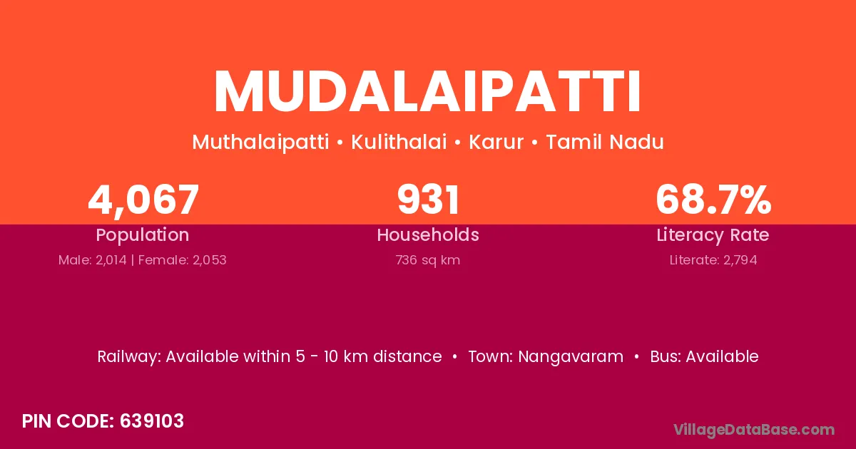 Mudalaipatti village has a total population of 4,067 people, of which 2,014 are males and 2,053 are females.