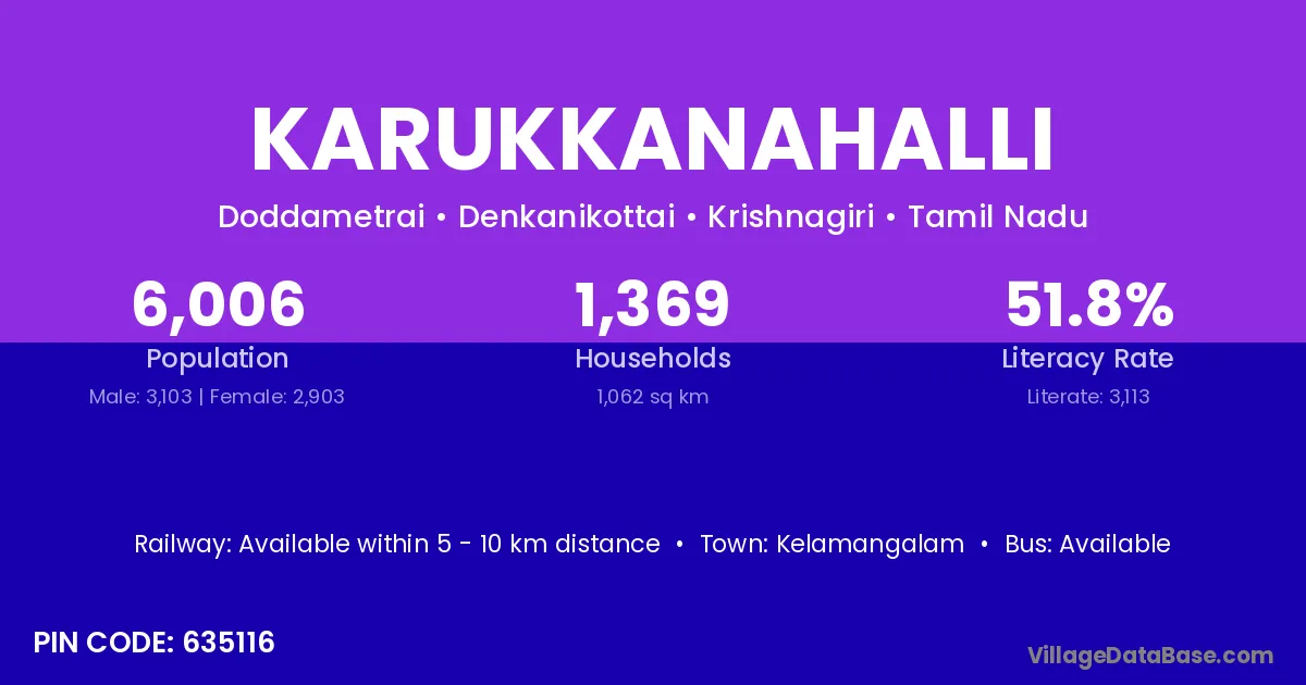 Karukkanahalli village has a total population of 6,006 people, of which 3,103 are males and 2,903 are females.