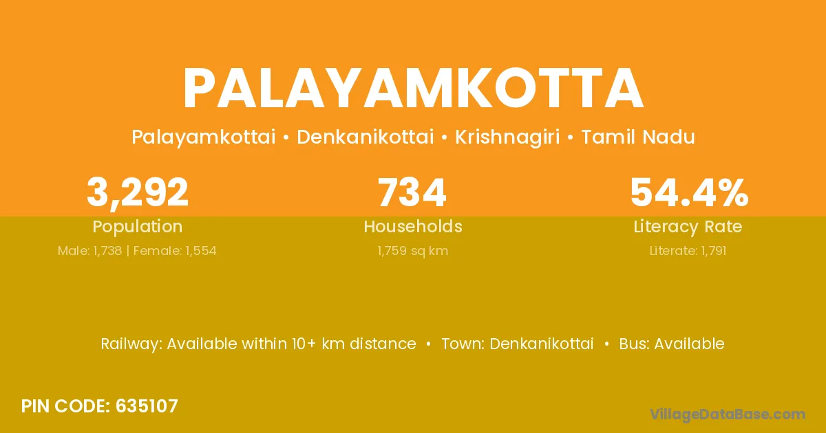 Palayamkotta village has a total population of 3,292 people, of which 1,738 are males and 1,554 are females.