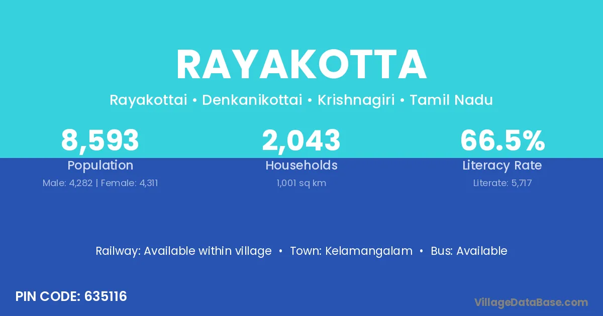 Rayakotta village has a total population of 8,593 people, of which 4,282 are males and 4,311 are females.
