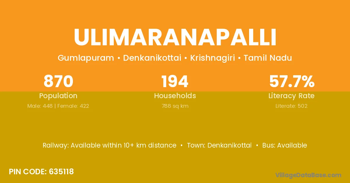 Denkanikottai is the nearest town to Ulimaranapalli village for major economic activities