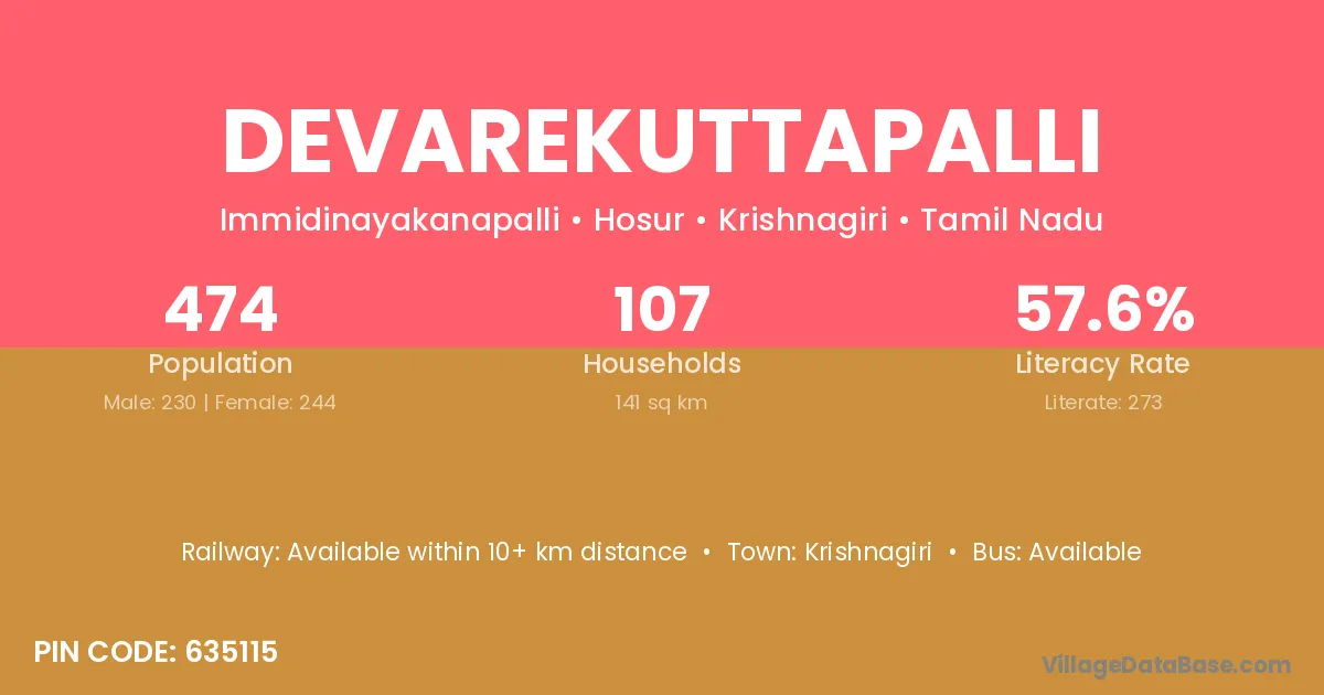 Devarekuttapalli village has a total population of 474 people, of which 230 are males and 244 are females.