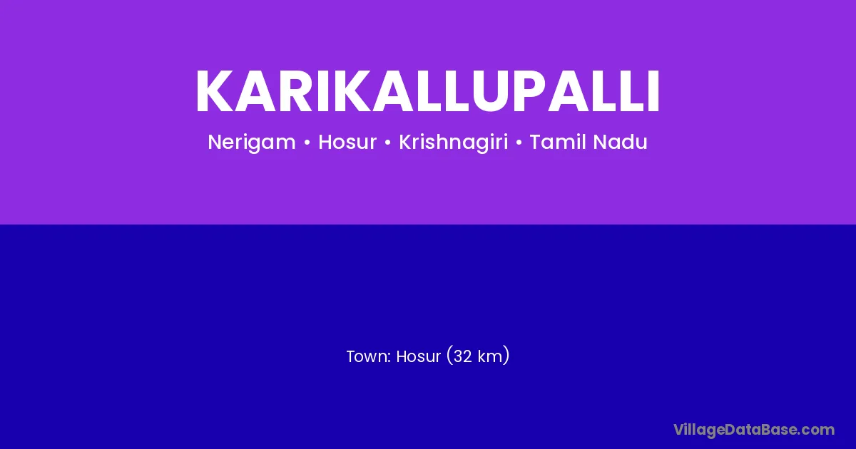 Hosur (32 km) is the nearest town to Karikallupalli village for major economic activities and is located approximately 32 km away.