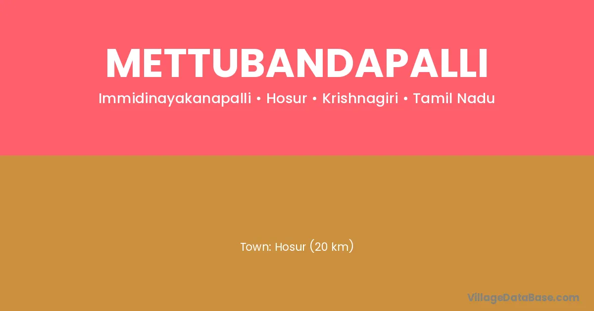 Hosur (20 km) is the nearest town to Mettubandapalli village for major economic activities and is located approximately 20 km away.