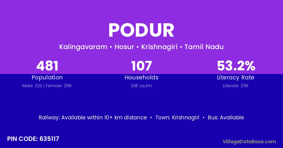 Krishnagiri is the nearest town to Podur village for major economic activities