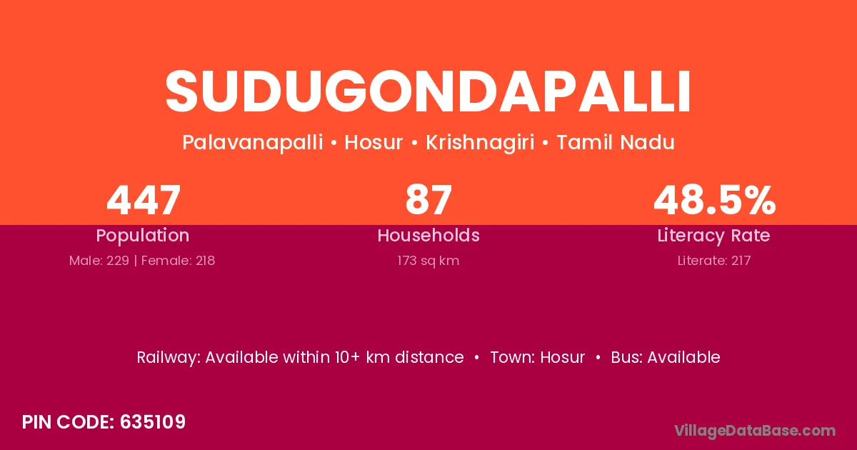 Sudugondapalli village has a total population of 447 people, of which 229 are males and 218 are females.