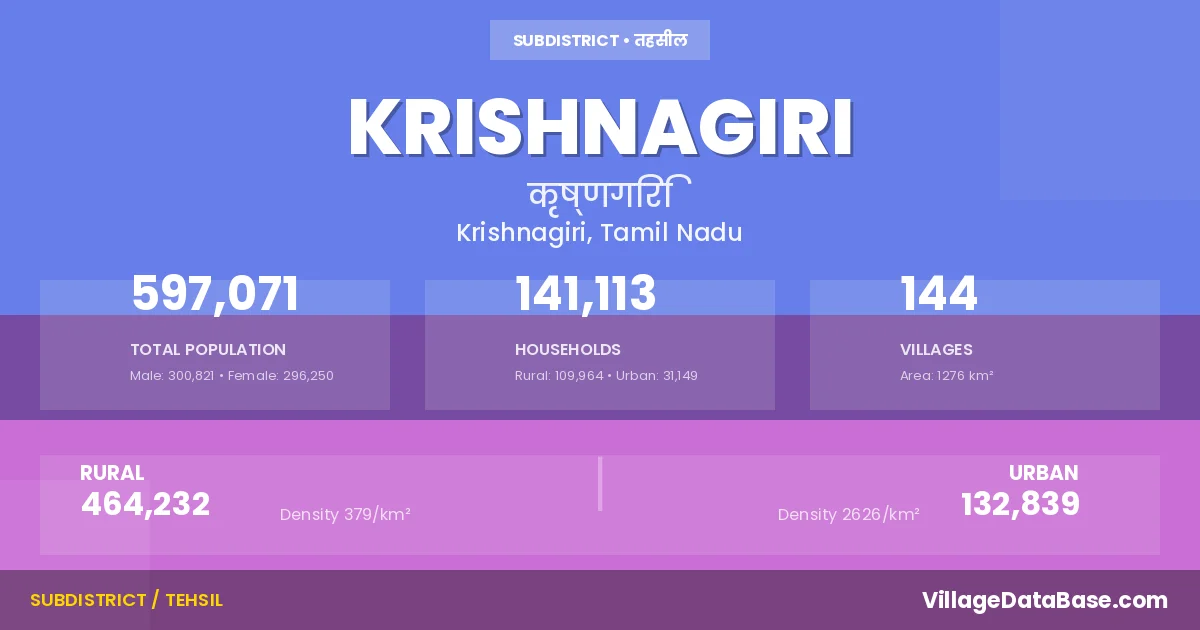 According to the 2011 census The total area of Krishnagiri Taluka is 1276 km², with a population of 597071 people. The population density is 468 inhabitants per square kilometre, and there are approximately 141113 houses in the sub district.