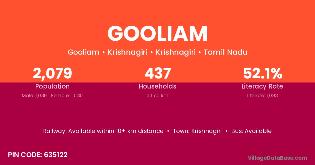 Krishnagiri is the nearest town to Gooliam village for major economic activities