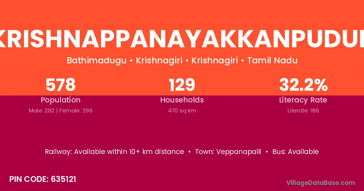 Krishnappanayakkanpudur village has a total population of 578 people, of which 282 are males and 296 are females.