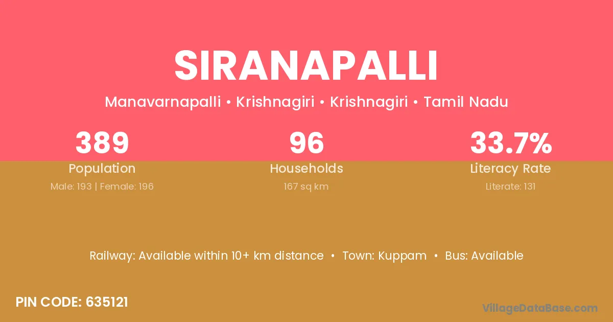 Siranapalli village has a total population of 389 people, of which 193 are males and 196 are females.