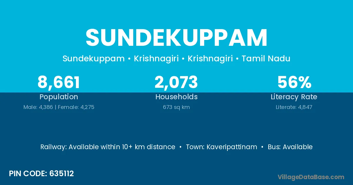 Sundekuppam village has a total population of 8,661 people, of which 4,386 are males and 4,275 are females.